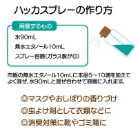 市販の無水エタノール10mLにハッカ油5〜10滴を加えてよく混ぜ、水90mLと混ぜ合わせてスプレー容器(ガラス製)に入れて使用してください。