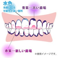 使い方は簡単。綿棒などで歯に塗布して軽く水ですすぐと新しい歯垢は赤紫に、古い歯垢は青紫に、虫歯注意部位は水色に染まりますので